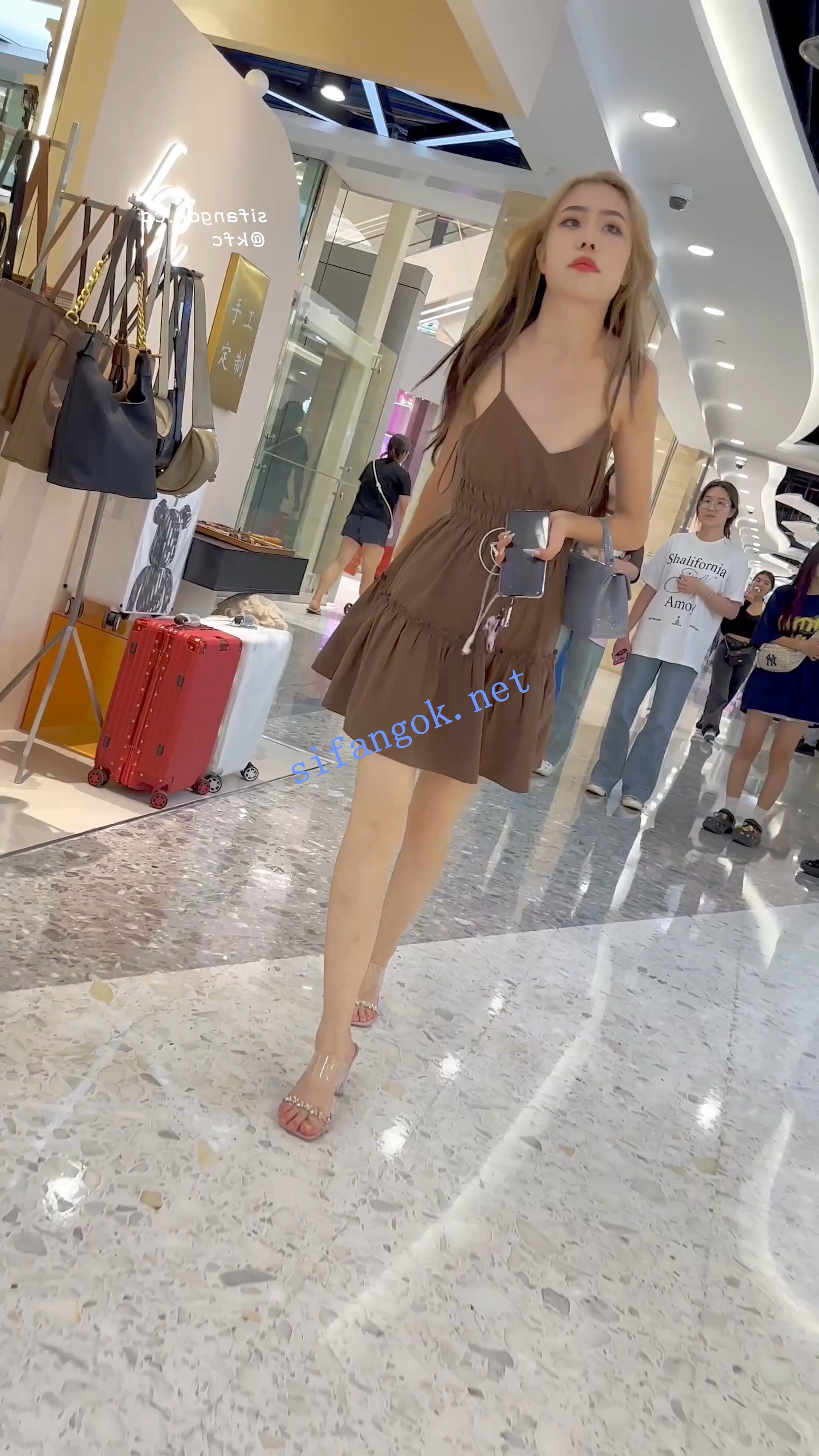 大嘴少妇独自逛街买美妆·背影很顶·吊带裙淡绿色内内
