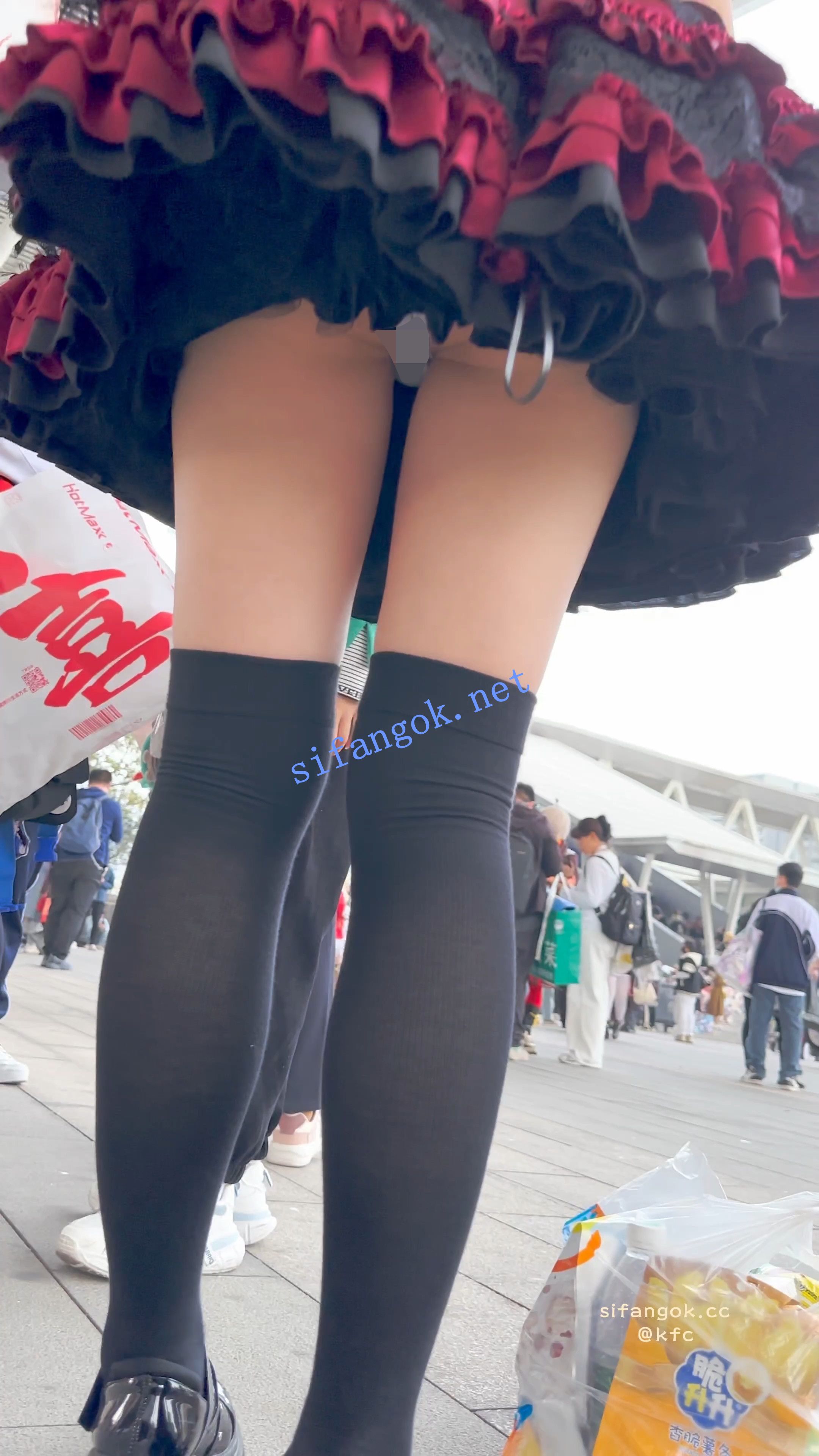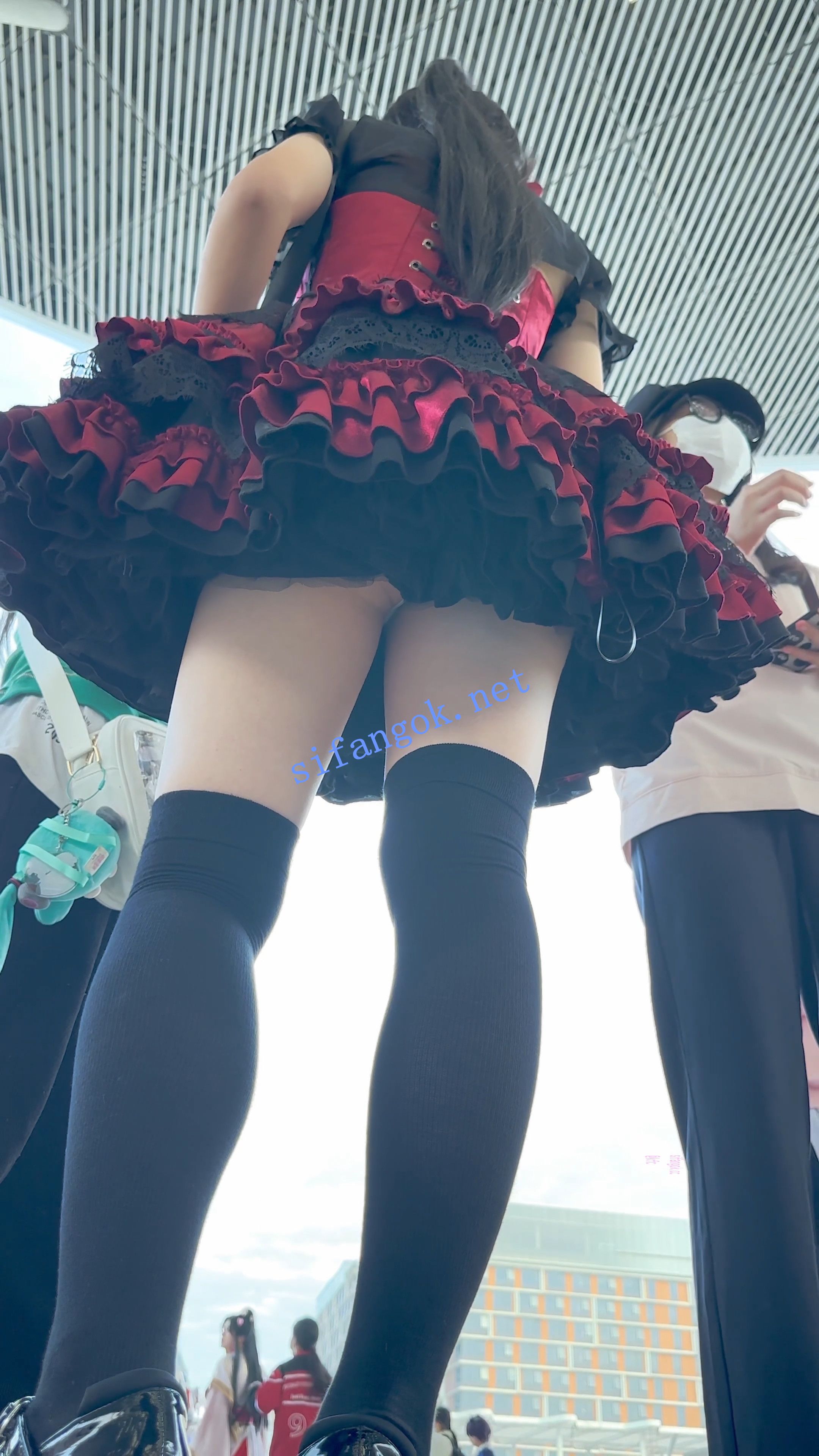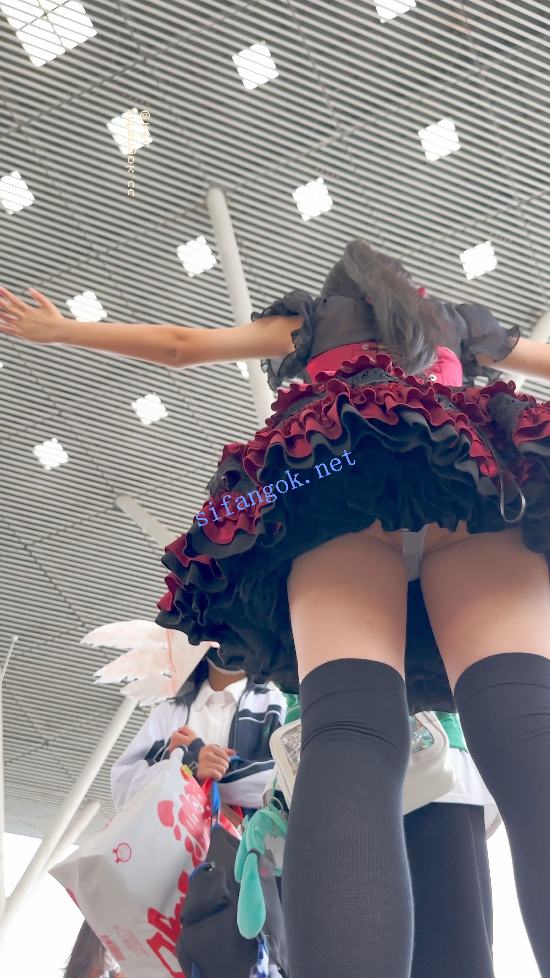 【KFC】短裙COSER展厅外聊天·没发现脚下的相机·翘屁股灰窄内